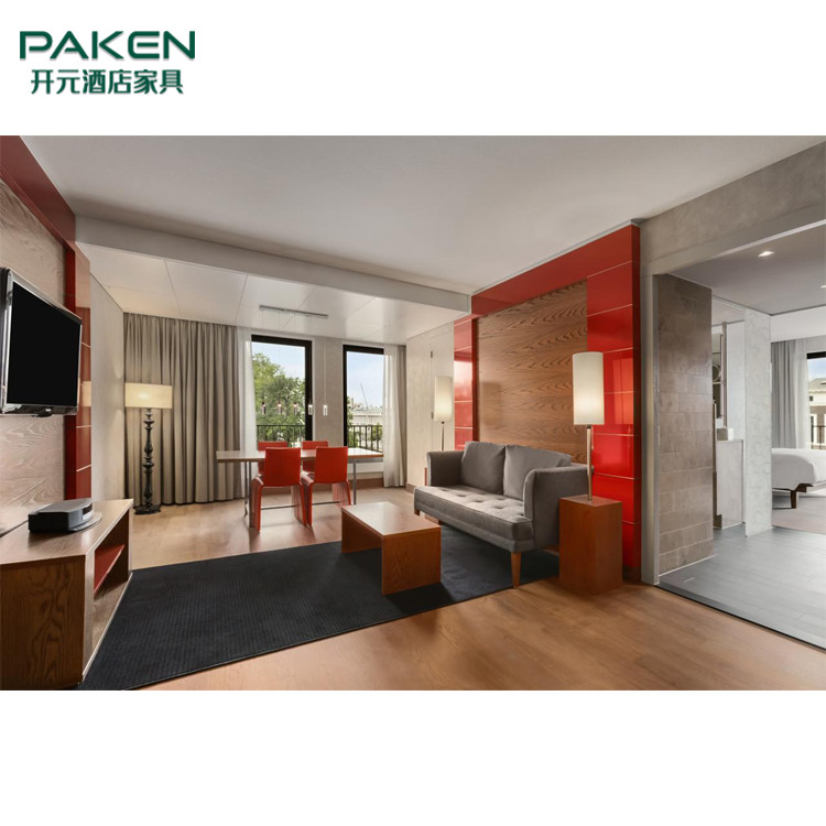 غرفة المعيشة: أريكة على شكل حرف L وطاولة شاي واحدة / وسادة / كرسي صالة وخلفية عثمانية / تلفزيون بسطح ورنيش أحمر ، تشطيب غير لامع.